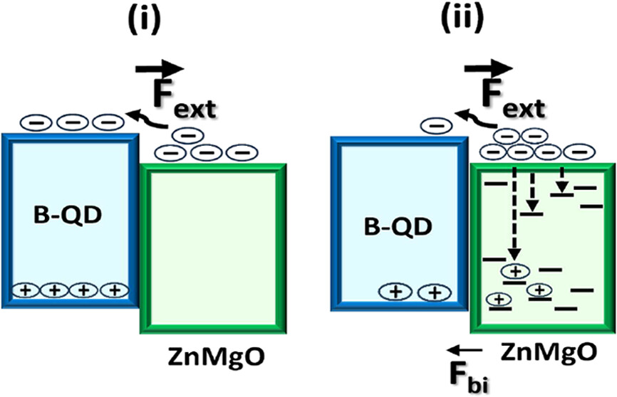 This study reveals that hole leakage into the ZnMgO ETL can be significant in B-QLEDs and can have adverse effects on it. PL and electrical measurements on electron-rich and hole-rich devices show that holes damage the ZnMgO layer by developing sub-band gap states in the ETL.