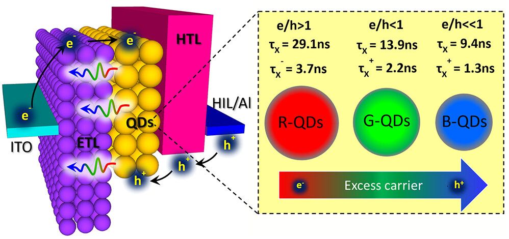 Comparative systematic investigations of inverted R-, G-, and B-QLEDs reveal significant differences in electron and hole injections among the three colors, resulting in significant differences in e/h ratios and charge balance among them. In general, R-QLEDs have electrons as excess carriers (i.e., e/h > 1) in their EMLs, whereas in both G- and B-QLEDs, the EMLs generally have excess holes (i.e., e/h < 1) with charge balance conditions being significantly worse in the case of B-QLEDs (i.e., e/h ≪ 1).