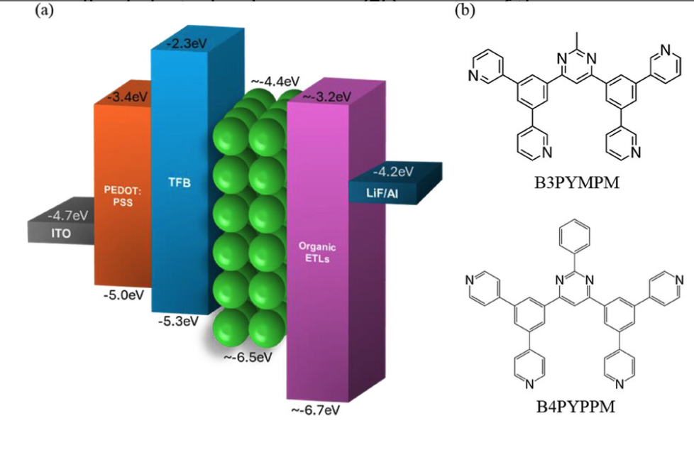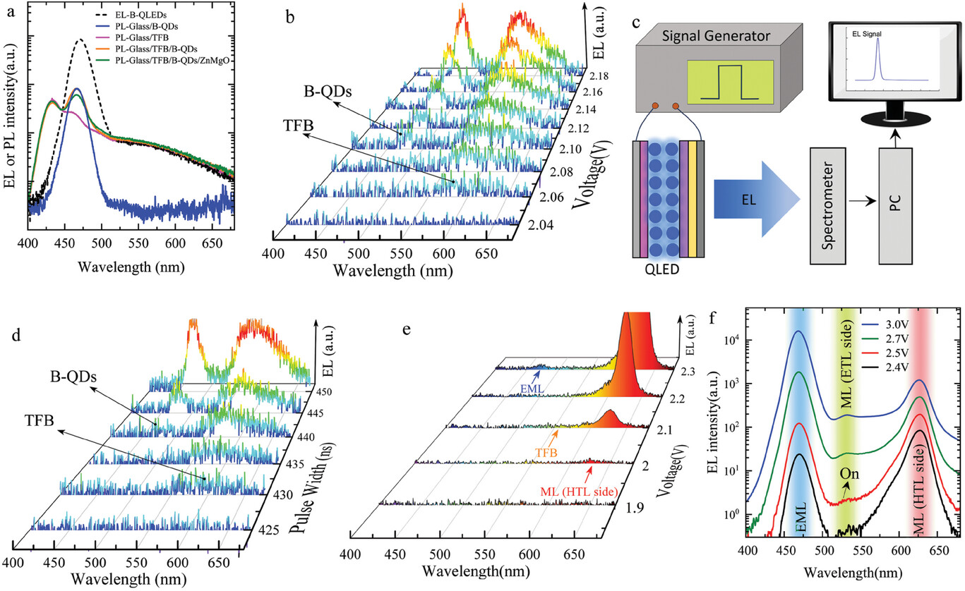 An increase in electron leakage and electron-induced damage to the hole injection layer (HIL) that leads to a deterioration in hole supply are found to play a key role in the rapid EL loss in B-QLEDs. EL and PL measurements on B-QLEDs, fabricated with and without luminescent MLs, show that the electron supply is easier than the hole supply, resulting in an electron e/h ratio >1 in the B-QDs-EML and significant electron leakage into the HTL and to the HIL.