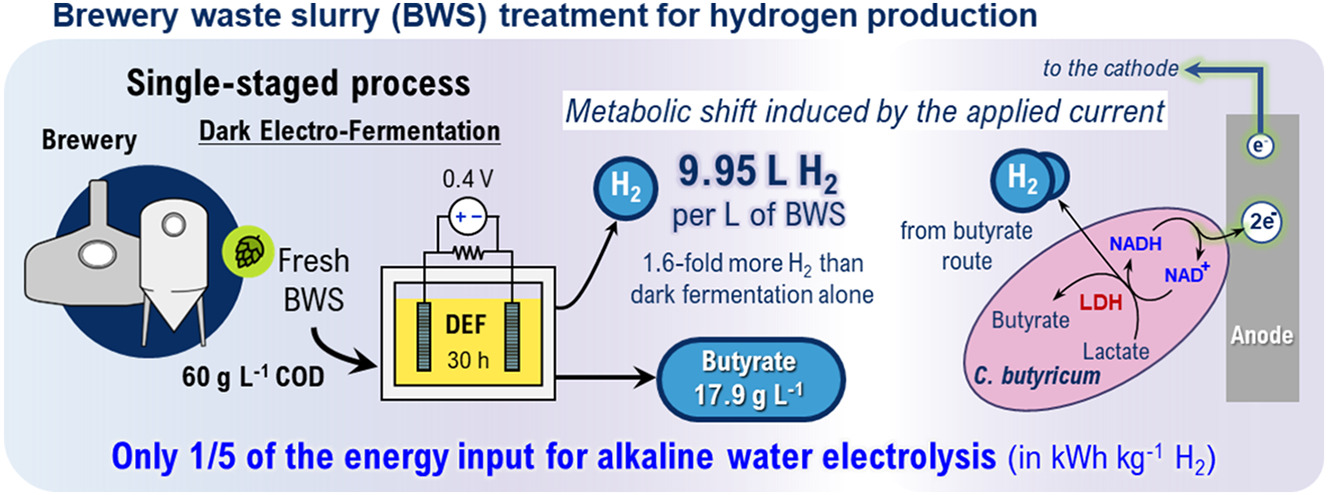 This study demonstrates that electro-fermentation is an attractive strategy to co-produce value-added chemicals and hydrogen from biomass-rich wastes like brewery waste slurries. By operating at 0.4 V, the process increased hydrogen production ~60 % compared to DF alone, accompanied by a notable butyric acid production of almost 18 g L−1.