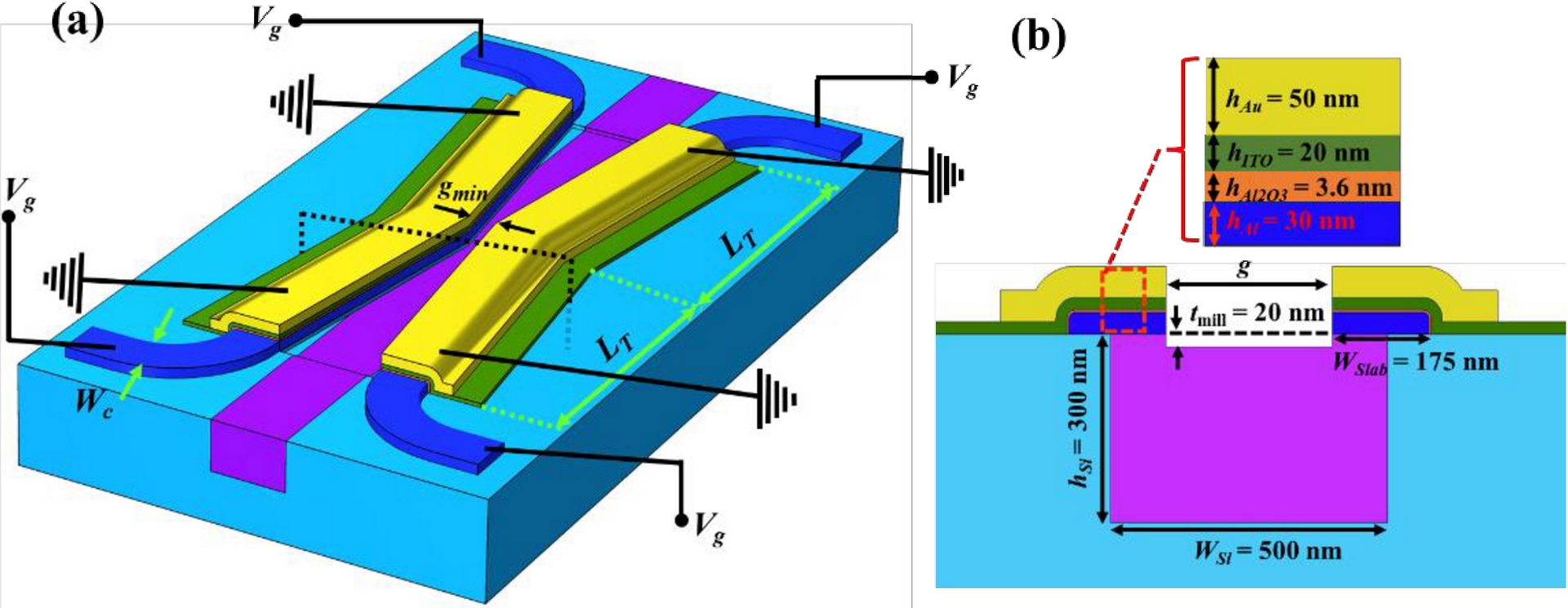By combining the nanoscale field confinement of surface plasmon polaritons with the ENZ effect, our modulators, integrated with silicon waveguides and optimized for operation at λ = 1550 nm, achieve a 3-dB bandwidth of 210 GHz, an insertion loss of 3 dB, and an extinction ratio of 5 dB for a device length of under 4 µm.