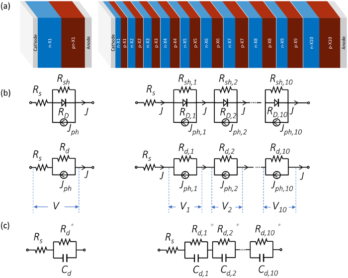 Steady-state current–voltage and impedance measurements under dark and increasing monochromatic irradiances were employed to investigate power conversion efficiency, resistance, capacitance, and quasi-open-circuit response times in single-junction (1 J) and ten-junction (10 J) In0.53Ga0.47As photonic power converters. A methodology for analyzing normalized sub-cell properties was introduced, enabling a more effective comparison between the two devices.