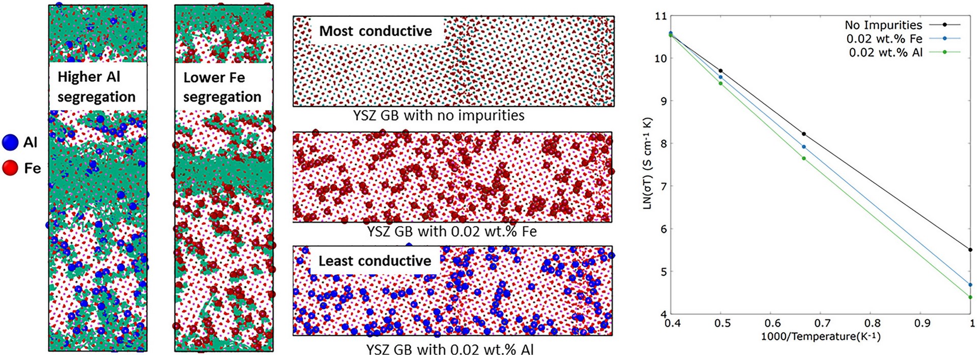 The present work systematically investigates segregation behaviors of aluminum (Al) and iron (Fe) impurities in YSZ grain boundaries by using molecular dynamics simulations. We have investigated the dynamics of Al and Fe impurities across two grain boundary configurations, symmetric and mixed boundaries, with respect to their relative impacts on oxygen ionic conductivity.