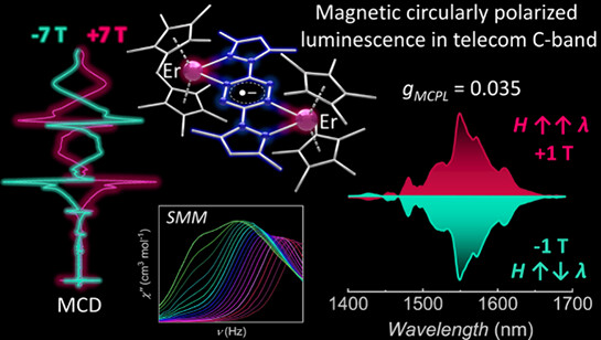 The magnetic and magneto-optical properties of a tetrazinyl radical-bridged ErIII metallocene, [(Cp*2ErIII)2(bpytz•–)][BPh4] (1; Cp* = pentamethylcyclopentadienyl, bpytz = 3,6-bis(3,5-dimethyl-pyrazolyl)-1,2,4,5-tetrazine), are reported.