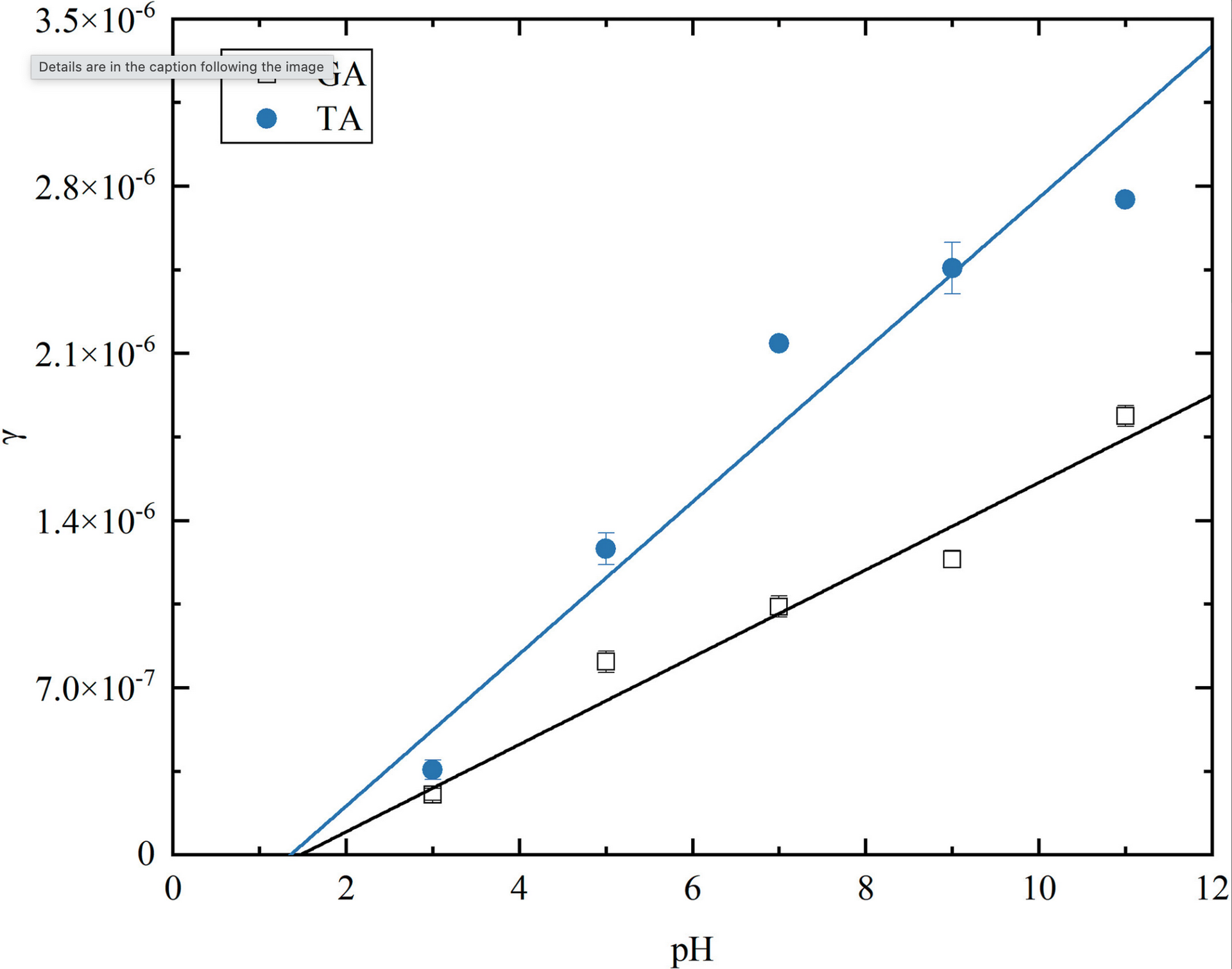 Humic-like substances (HULIS) are a ubiquitous reactive component of atmospheric aerosol. They participate in the formation of secondary organic aerosols via chemical reactions with atmospheric oxidants. Here, we assess the influence of transition metal ions (namely ferric iron, Fe(III)), and nitrate ions (NO3−) on the heterogeneous reaction of gaseous NO2 with an aqueous film containing gallic acid (GA) or tannic acid (TA) as proxies for HULIS.