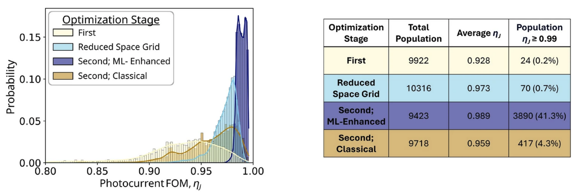 We study a ML-enhanced method which accelerates the design optimization of multi-junction PPCs. It produces a much greater number of designs attaining the highest , these have a greater design variability, and are obtained at a lower computational cost than those found using classical optimization algorithms alone. These advantages, coupled with the demonstrated knowledge discovery, exemplify an expansion in the design perspective which empowers the design choice under external constraints and preferences