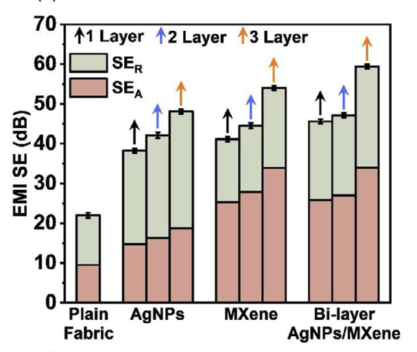 We developed a novel hybrid knitted fabric using lightweight, flexible copper-cotton core-spun yarn, functionalized with alternating bi-layer coatings of AgNPs and MXene nanosheets. The fabric exhibited an excellent EMI SE of 59.4 dB in the X-band, showcasing the strong synergistic interaction between AgNPs and MXenes.