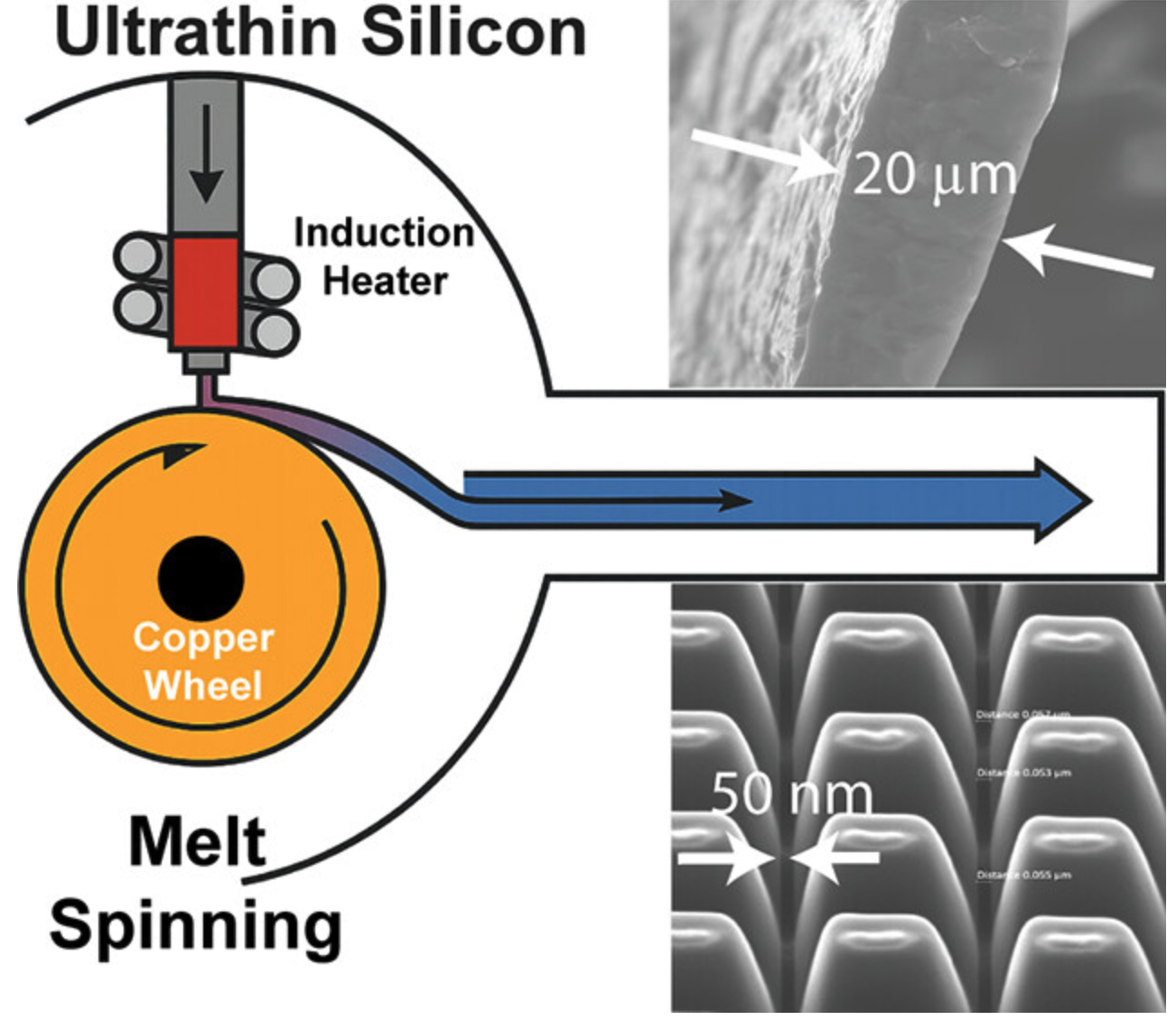 This study presents a novel method for fabricating free-standing ultrathin silicon substrates using a melt-spinning technique. By directly extruding molten silicon onto a rotating copper wheel in a controlled argon environment, we successfully fabricated polycrystalline silicon substrates with dimensions of 1 × 5 cm and a thickness below 20 μm, all within a processing window of 1 h.