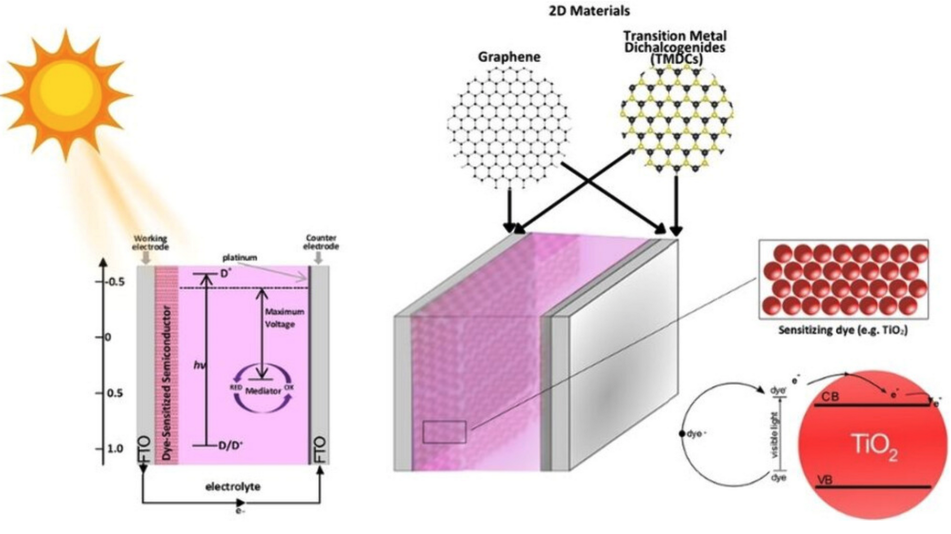 In this review, we highlight recent advances in the components of DSSCs, with a particular focus on recently published works between 2017 and 2022. The impact of COVID-19 on the research community can be seen in a drop in the number of publications in the year 2021. We will describe the development process in general terms. Special attention will be given to the advancement and use of 2D materials to increase the efficiency of working and counter electrodes.