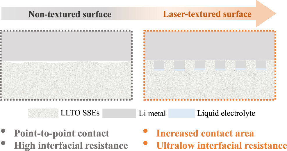 This work, for the first time, applied ultrafast-laser texturing to produce precisely controllable micropatterns onto LLTO solid-state electrolytes (SSEs). By adjustment of the laser parameters, grooves with tailored orientations and sizes can be produced onto SSE pellets. Laser processing results in a color shift related to the reduction of Ti4+ cations, as well as the formation of an amorphous layer redeposited on the sample surface.